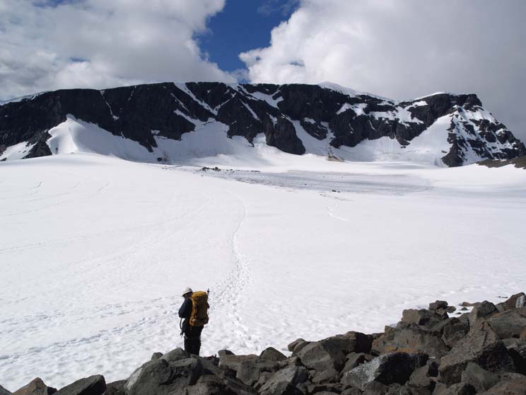 Björlingin jäätikön itäreunan kivikolle tulimme kello 11. Kebnekaisen valkoinen huippu oikealla ylhäällä. Östra ledenin reitti kulkee edessä vasemmalla näkyvälle lumiharjanteelle.