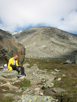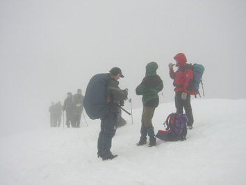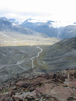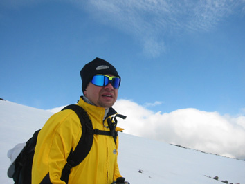 Glittertindenille sumusateessa Tauon jälkeen oli loivaa nousua muutaman sata metriä, mutta siten alkoi reitin jyrkin osuus. Siinä näimme myös orkneylaiset, joilla olivat syömässä. Vilkutusten jälkeen matka jatkui. Jyrkkä osuus oli kivikkoinen rakkarinne, joka nousi kilometrin matkalla 400 metriä, 1700:sta 2100 metriin. Reitti oli kiviin merkitty punaisin T-kirjaimin, jotka oli juuri maalattu uudelleen ja erottuivat hyvin – vain joissakin vaikeammissa paikoissa, joissa näkyvyys oli kivien takia huono, seuraavaa merkkiä piti etsiä. Jyrkän osuuden jälkeen reitti tasaantui, mutta nousisi vielä jäljellä olevan puolentoista kilometrin matkalla 350 metriä. Samalla rinne muuttui valkoiseksi ja jatkoimme matkaa lumessa. Jalkamme upposivat siihen noin parikymmentä senttiä. Sää oli sumuinen emmekä nähneet Glittertindenin huippua – vain puolipyöreää valkoista vuoren rinnettä. Näimme myös toisen ryhmän, joka meni pari sataa metriä edellämme. Vajaa kymmenen hengen ryhmällä oli rinkat selässään, joten saavutimme sen aika nopeasti. He olivat menossa itäpuolella olevalle Glitterheimin retkeilymajalle, mutta halusivat laaksoreitin sijaan mennä Glittertindenin huipun kautta. Jatkoimme matkaa ja rinkkaryhmä jäi taaksemme. Orkneyn miehiä emme nähneet. Glittetindenin pohjoisrinne on äkkijyrkkä ja pudotusta huipulta alas pohjoisen Grotbrean jäätikölle on noin parisataa metriä. Juurelta lähtee pohjoiseen reilun kahden kilometrinpituinen Trollsteineggje-vuorijono, jonka korkein huippu nousee 2300 metriin jäätikön vastaavasti laskeutuessa. Eteläpuolella taas oli jyrkkä, mutta kulkukelpoinen rinne. Se laskeutuu alas 650 metriä kilometrin matkalla. Allamme oleva jonkinlainen polku tuntui siis varsin turvallisuutta antavalta. Sää oli sumuinen ja näkyvyys vain noin 50 metriä. Lumipolku eteni huipun eteläpuolella rinnettä pitkin. Huippua ei näkynyt ja sen määrittäminen oli vaikeaa. Hetken pohdittuamme päätimme kääntyä pohjoiseen ja katsoa, näkyisikö huippua siellä. Tulimme länsi-itä –suuntaiselle harjanteelle, jonka pohjoispuolella oli jyrkänne. Varoimme menemästä liian lähelle jyrkännettä, sillä siinä saattaisi olla ns. lippoja. Tuulen puhaltaessa etelästä muodostuu talven mittaan helposti jyrkänteen ylitse menevä lumilippa, jonka päälle ei pidä astua – siitä voi pudota lävitse. Harjanteessa oli erilaisia huippuja emmekä tarkalleen tienneet, missä kohtaa olimme. Erkki epäili varsinaisen huipun olevan vielä idempänä. Rinkkaryhmä oli lähtenyt peräämme ja he myös tulkitsivat huipulle olevan vielä matkaa. Glittertindenin huipulle Niin lähdimme harjannetta pitkin itään. Harjanne nousi hiljalleen, mutta siinä oli vielä toinenkin valehuippu. Sen itäreuna oli hyvin jäinen ja antoi esimakua siitä, mitä Glittertindenin huippu vaikeimmillaan on. Jääosuus oli kuitenkin vain muutaman kymmenen neliömetrin kokoinen ja helposti kierrettävissä. Emme tarvinneet jäärautoja. Jäärinteen takaisesta notkosta alkoi varsinainen viimeinen nousu Glittertindenille. Huipun saavutimme noin 14.30. Olimme tulleet Spiterstulenista pysähtymisineen nelisen tuntia. Huippu oli sumussa emmekä nähneet eteläpuolen Veobrean jäätikköä emmekä pohjoisen Trollsteineggjeä. Odottelimme huipulla sään selkenemistä ja otimme huipulla valokuvia. Sanoin rinkkaryhmän johtajalle, että ihailen hänen suunnistustaitoaan löytää huippu. En pidä itseänikään huonona suunnistajana, mutta huipun paikantaminen sumussa oli ollut minulle vaikeaa. Tähän rinkkamies vastasi, että hänen pitääkin tietää, missä mennään, sillä hän toimii norjalaisena vuoristo-oppaana ja käy Glittertindenillä useasti vuodessa. Lisäksi hän näytti minulle Gps:ää, joka on hyvä apu sumussa. Glittertindenin huipulla oli kylmä. Tuuli puhalsi ja lumipeite sekä jää hohtivat pakkasta. Vajaan puolen tunnin huipulla oleskelun jälkeen lähdimme Erkin kanssa jälkiämme takaisin kohti länttä ja rinkkaryhmä jatkoi itään kohti edessä olevaa laaksoa ja retkeilymajaa. Matka alaspäin lumihangessa sujui nopeasti ja tulimme lumirajalle jo vajaa puolituntia myöhemmin. Samalla taivas selkeni ja näimme Glittertindenin takanamme. Laskeuduimme auringonpaisteessa jyrkän osuuden ja pysähdyimme menomatkan kivelle Steindalselven varrella. Oli aika syödä päivän pääateria. Syödessämme Orkneyn kaksikko tuli Glittertihdeniltä ja tarjosivat meille viskipaukut huipulla käynnin kunniaksi. Sitten he jatkoivat matkaa. Me aterioimme itsemme kylläisiksi. Sen jälkeen pakkasimme tavaramme ja matka jatkui menojälkiä Spiterstuleniin. Sinne tulimme noin 19.30. Glittertindenin retkemme oli kestänyt taukoineen yhdeksän tuntia. TH |