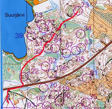 Silmälasit eivät tuntuneet istuvan ja niin vedin ne päästäni kaulaan. Otanpa sitten takaisin nenälleni, jos tarve tulee. Toiseksi mieleen tuli ajatus, olenko varmasti ensimmäisen mäen nenän päällä, vai olenko sittenkin kiertänyt sen vasemmalta ja nousemassa jo toiselle mäelle? Matkanmittaus oli alkukiireessä unohtunut - unohtunut siitä huolimatta, että se 1970-luvun aktiivikauden jälkeen menee vielä päälle aivan tavallisella maantielenkilläkin. Vasemmalta näkyi kuitenkin järven lahti, jonka pohjukan rantaviiva oli lännessä. Sen perusteella oli helppo tarkistaa, että olin juuri ylittänyt ensimmäisen mäen leveän nenän. Sen jälkeen juoksu jatkui - nyt jo alkua rennommin. Ja metrimittarikin alkoi naksuttaa.