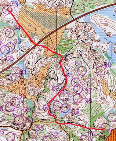 Maastossa ja kartassa oli paljon pienipiirteistä tavaraa. Se vaati tarkkaa kartan lukua, vaikka reitti oli selvä ja laajat kokonaisuudet erottuivat kohtuullisesti. Reitti kulki edessä olevan laakean mäen ylitse sen korkeimman kohdan oikealta puolelta. Sen jälkeen edessä oli uusi laakea mäki, jonka edessä oleva jyrkänne ja sen takana oleva korkein kohta edelleen oikealta puolelta ohitse. Ja rasti löytyi takarinteestä pistekukkulan vierestä.