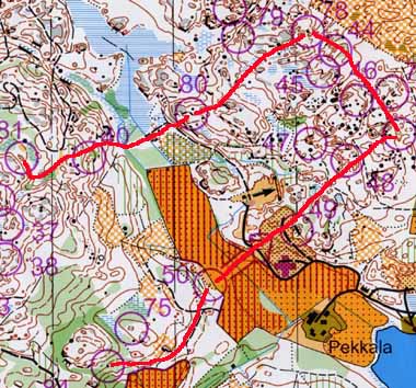 Seuraavalle rastille (koodi 81) olikin sitten pellon päässä olevan suon ylityksen jälkeen kahdeksan käyrän nousu. Oltiin palaamassa takaisin kakkos- ja kolmosvälin suurelle mäelle. Rastille yritin nousta pohjoisesta tulevaan u-mutkan tekevään polkuun tukeutuen. Matkan mittaaminen ylämäessä on vaikeaa ja u-polku ei tuntunut tulevan vastaan. Löysin yhden juoksu-uran, ja näytti, kuin se olisi yhtä kuin polku, mutta sananmukaisesti edellisten osuuksien puhki juoksema. Se vain nousi nenää pitkin eikä notkossa niin kuin kartan mukaan olisi pitänyt. Missä siis olen ja mihin suuntaan on mentävä, jotta olen nopeasti rastilla. Paniikki alkoi hiipiä yläselästä takaraivoon. Nyt rauhallisesti. Samalla juoksin eteenpäin ja tein yhteenvedon: olen kiivennyt riittävästi ja silloin minun täytyy olla rastin kaakkoispuolisessa notkossa, u-polun eteläpuolella. Muutin kulkusuunnan luoteeseen, nousin käyrän verran ja näin edessä kalliokumpareen, jonka vieressä oleva rasti löytyi heti.