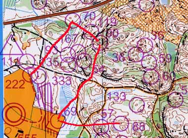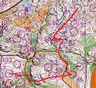 Kun yleisö ei enää nähnyt, hiljensin vauhtia ja aloin lukea karttaa. Seuraava rasti oli edessä olevan mäen länsirinteen pieni kumpare. Se oli 65 metriä yleisörastia korkeammalla. Reitti oli selvä: suoraan hivenen oikealla olevalle polulle kaarten ja sitä pitkin seuraavaan polkujen risteykseen, josta jyrkänteen oikealta puolelta 40 metriä ylös ja sitten reilut sata metriä länsirinnettä suoraan rastille. Rasti oli rinteessä - se ei siis olisi helppo. Polkujen risteyksestä sain perääni letkan. Sen kirittämä yritin juosta jyrkänteen viereistä rinnettä ylös, mutta se ei enää oikein tahtonut onnistunut. Jalat painoivat ja pian annoin periksi. Aloin kävellä, polvista tukea ottaen ja itseäni ylöspäin kammeten. Siirryin polun reunaan antaakseni tilaa perässä tuleville.