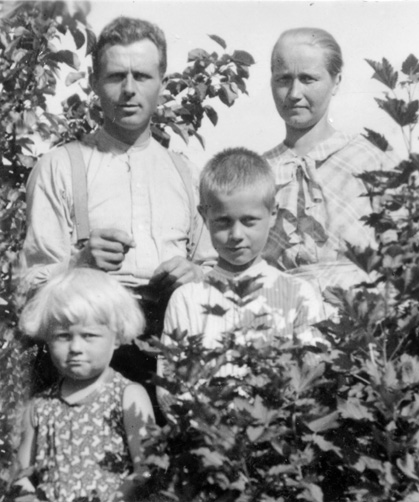 1935 kesällä Pappani Yrjö, mummoni Siviä, isäni Aaro ja pikkusiskonsa Airi Nyrölän Rantalassa. Pappani sormet vetävät lankaa, jonka toinen pää on kameran laukaisimessa. Yhteiskuva on valmis.