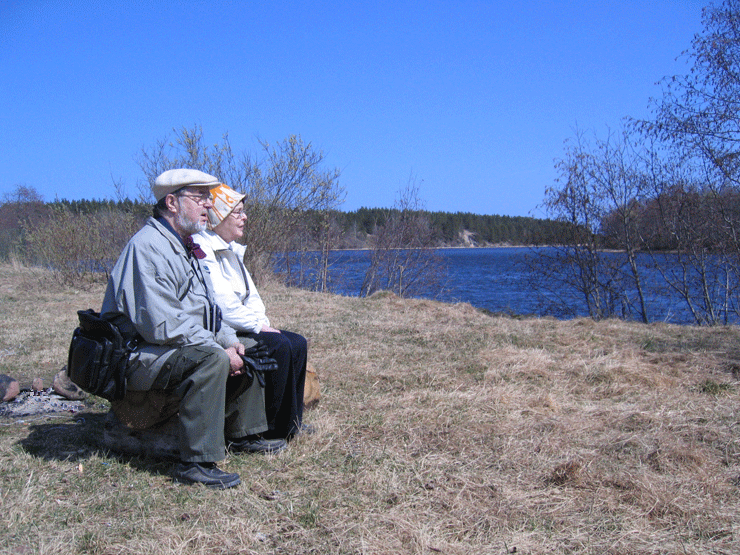 Aaro ja Leena joen rannalla. Taustalla Taipaleen harju. Taukopaikalla sijaitsivat joen yli Koukunniemeen päässeen vihollisen läntisimmät taisteluhaudat.